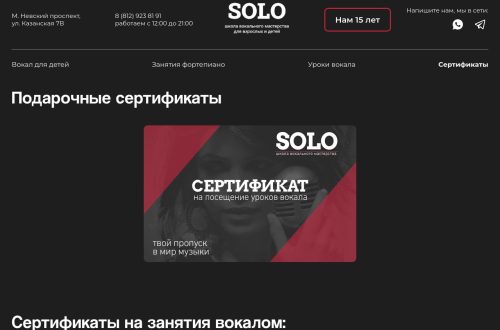 Профессиональное обучение вокалу открывает двери в мир музыки. Сертификат школы вокального мастерства Solo станет отличным подарком для творческих людей, которые любят петь и хотят усовершенствовать свои навыки в этом искусстве! График проведения занятий составляется с учетом пожеланий учеников. В школе Solo предусмотрены различные программы, разработанные для новичков и опытных исполнителей. Обучением занимаются педагоги, имеющие высшее профильное образование. Полученные навыки вокалисты смогут продемонстрировать на отчетных выступлениях, которые проводятся каждые 2 месяца. Кроме того, слушателям предоставляется возможность записывать песни в собственном исполнении в профессиональной студии. Обучение проводится индивидуально и в группах. Благодаря большому опыту педагогов результат заметен уже через 5 месяцев. Вы хотите порадовать творческого человека, который обожает петь или мечтает заниматься…